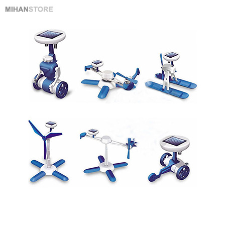 کیت رباتیک شش کاره خورشیدی طرح جدید یک بسته ی رباتیک است که شامل تمامی اجزای مورد نیاز برای تهیه و ساخت یک ربات کامل می باشد. شما می توانید بعد از سر هم کردن اجزای این کیت یک ربات خورشیدی زیبا بسازید که می تواند به اشکال مختلف در بیایید: قایق خورشیدی ، ربات هلیکوپتر خورشیدی ، ربات خورشیدی ، خودرو خورشیدی ، هواپیمای خورشیدی ، آسیاب بادبی خورشیدی. پس از ساختن این اشکال کافیست آن را زیر نور خورشید قرار دهید تا وسیله شما شروع به حرکت کند.