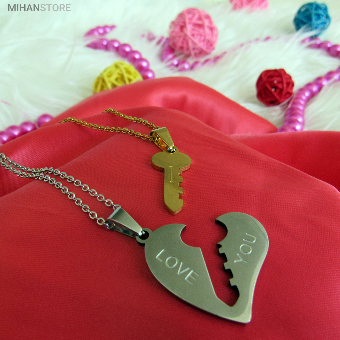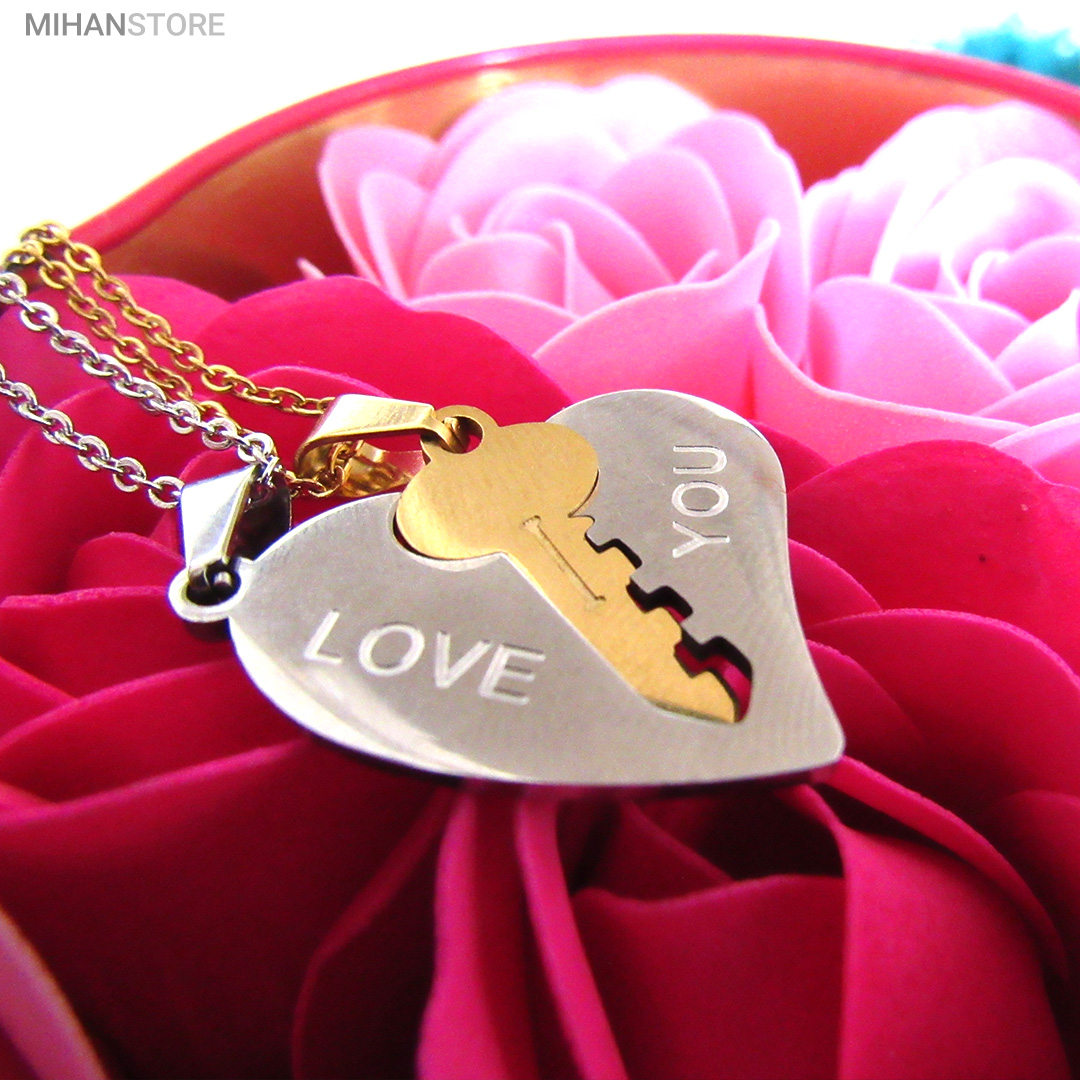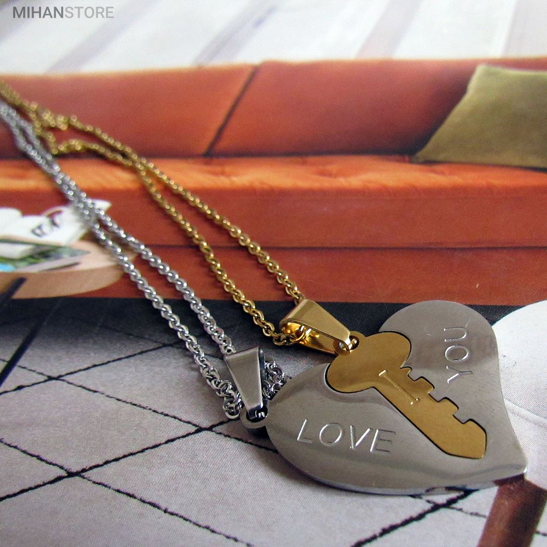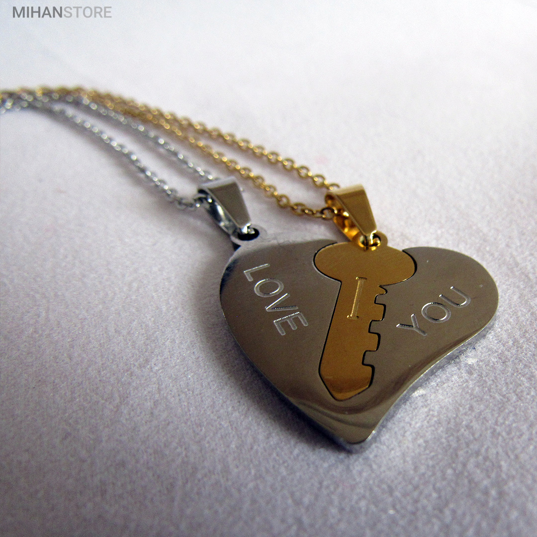 گردنبند دو تکه قلب و کلید استیل رنگ ثابت و ضد حساسیت که از یک پلاک قلب نقره ای و یک پلاک کلید طلایی تشکیل شده است و می تواند هدیه ای زیبا برای روز تولد و روز ولینتاین و… باشد. این مجموعه گردنبند زنانه و مردانه از جنس استیل Stainless Steel بوده و کلمه ی I LOVE YOY به معنای "دوستت دارم" با زیبایی و ظرافت بر روی آن ها حک شده است. این زیور به دلیل ابعاد ظریف و طراحی ساده و زیبایی که دارد براحتی مورد قبول سلیقه های خاص قرار میگیرد. گردنبند زنانه ی این مجموعه قلبی شکل کوچک با ابعاد 30 میلی متر است که قلب به رنگ نقره ای و کلید به رنگ طلایی است. طول زنجیر این آویز 44 سانتی متر است. استفاده از مواد اولیه ی با کیفیت، ظرافت در طراحی و همچنین استفاده از واژه ی "دوستت دارم" این مجموعه را به انتخاب مناسبی برای عشاقی که می خواهند یادگاری ای برای عشق جاودانه ی خود داشته باشند، تبدیل کرده است. همچنین زیبایی و خاص بودن  این محصول یک هدیه ی مناسب و جالب برای سالگرد ازدواج و یا هر مناسبت مشابه دیگر میباشد.