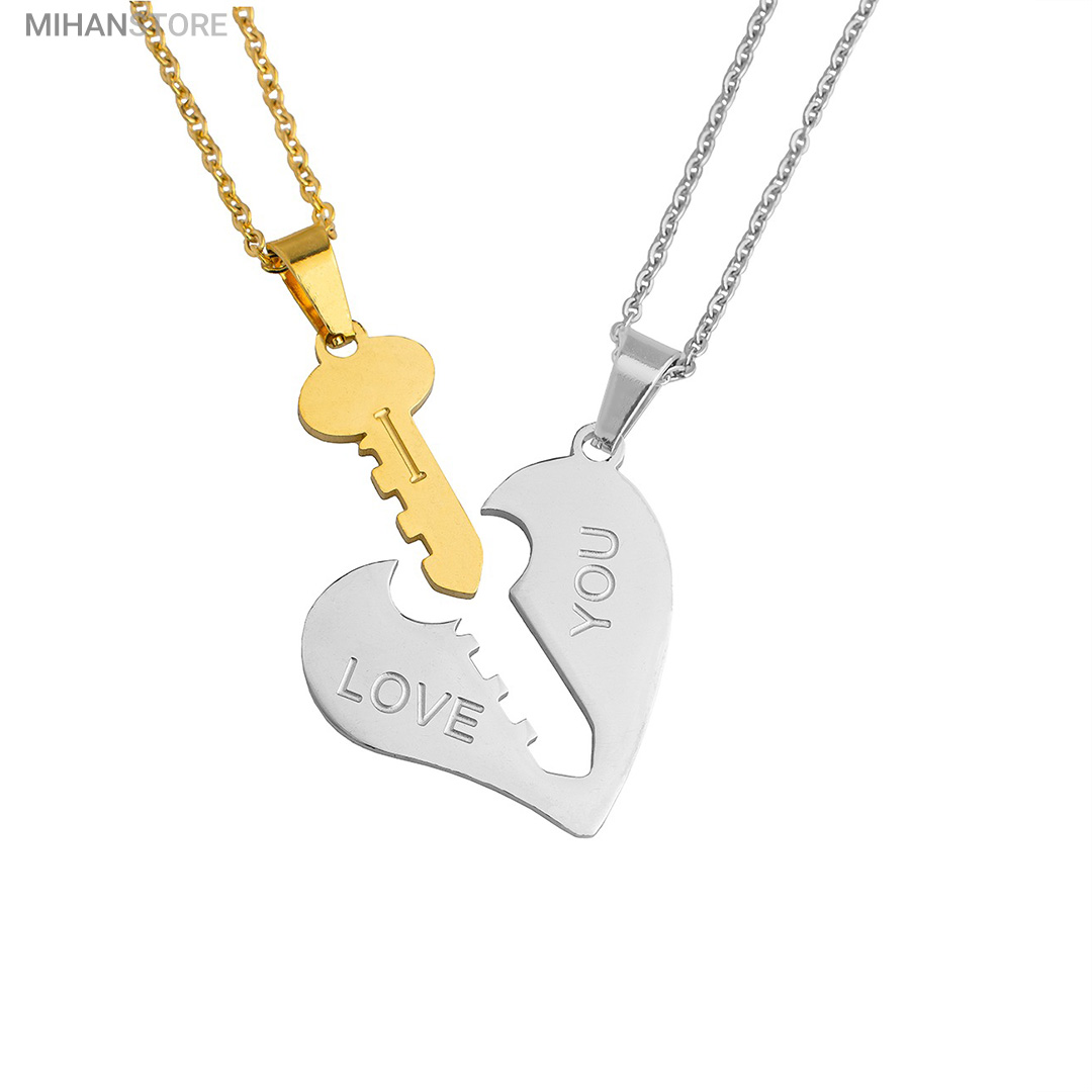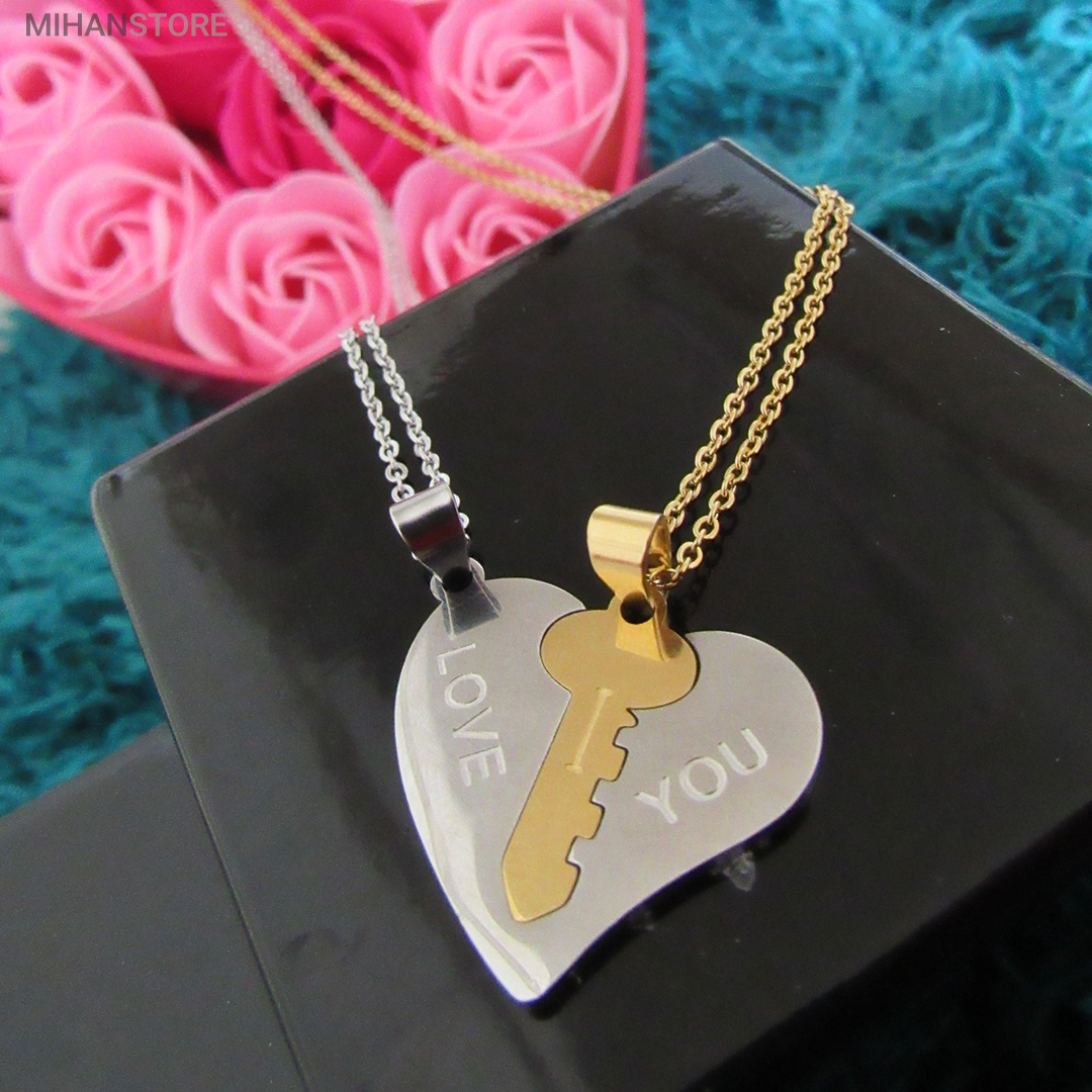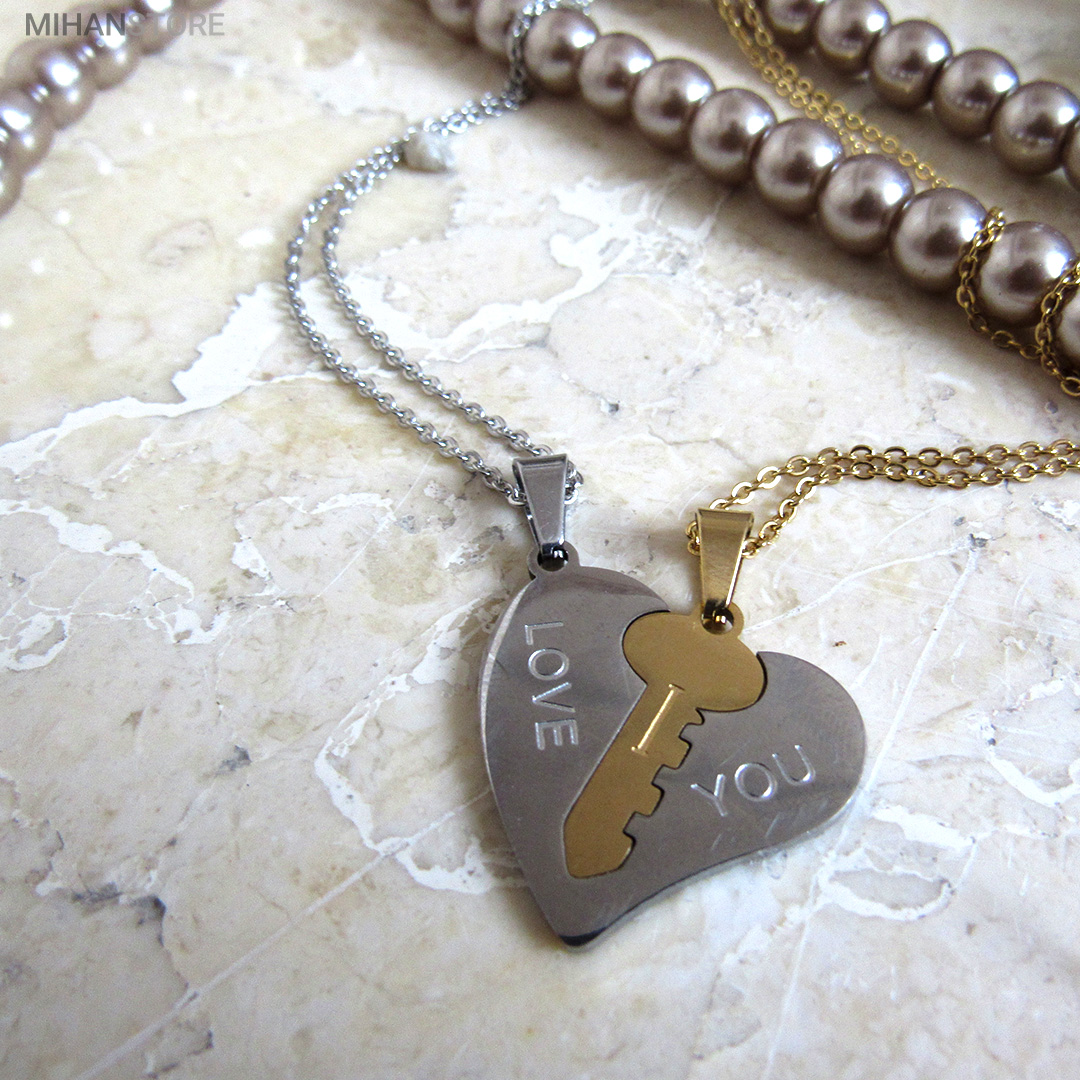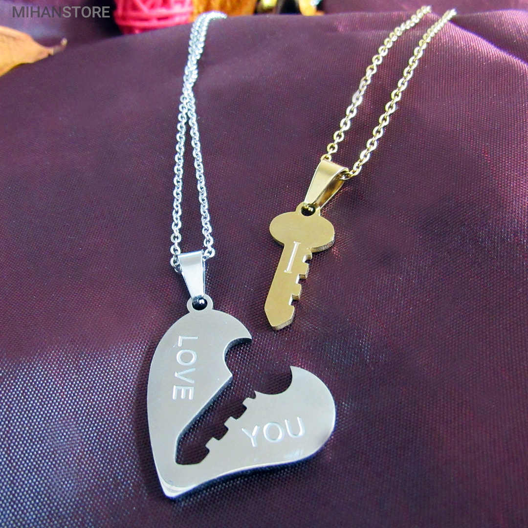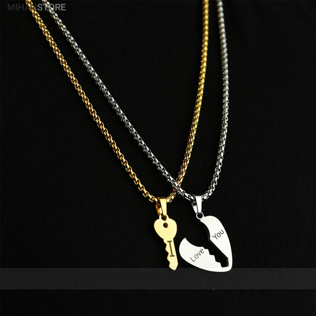 گردنبند دو تکه قلب و کلید استیل رنگ ثابت و ضد حساسیت که از یک پلاک قلب نقره ای و یک پلاک کلید طلایی تشکیل شده است و می تواند هدیه ای زیبا برای روز تولد و روز ولینتاین و… باشد. این مجموعه گردنبند زنانه و مردانه از جنس استیل Stainless Steel بوده و کلمه ی I LOVE YOY به معنای "دوستت دارم" با زیبایی و ظرافت بر روی آن ها حک شده است. این زیور به دلیل ابعاد ظریف و طراحی ساده و زیبایی که دارد براحتی مورد قبول سلیقه های خاص قرار میگیرد. گردنبند زنانه ی این مجموعه قلبی شکل کوچک با ابعاد 30 میلی متر است که قلب به رنگ نقره ای و کلید به رنگ طلایی است. طول زنجیر این آویز 44 سانتی متر است. استفاده از مواد اولیه ی با کیفیت، ظرافت در طراحی و همچنین استفاده از واژه ی "دوستت دارم" این مجموعه را به انتخاب مناسبی برای عشاقی که می خواهند یادگاری ای برای عشق جاودانه ی خود داشته باشند، تبدیل کرده است. همچنین زیبایی و خاص بودن  این محصول یک هدیه ی مناسب و جالب برای سالگرد ازدواج و یا هر مناسبت مشابه دیگر میباشد.