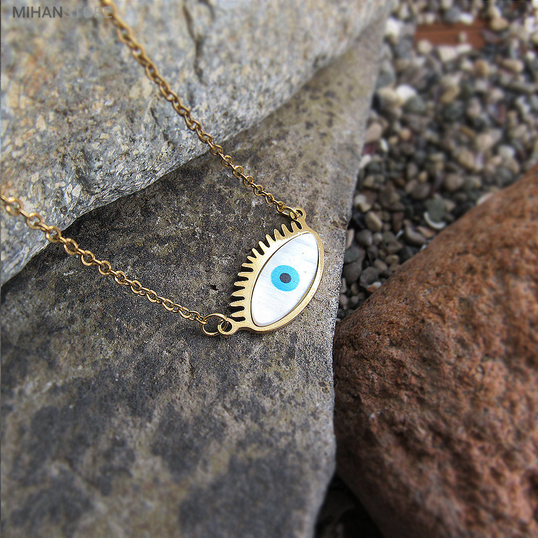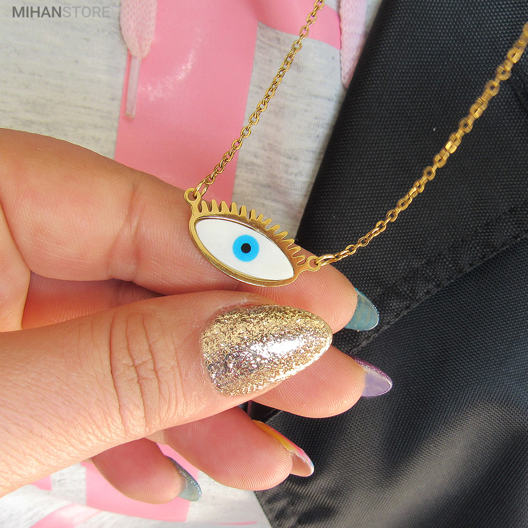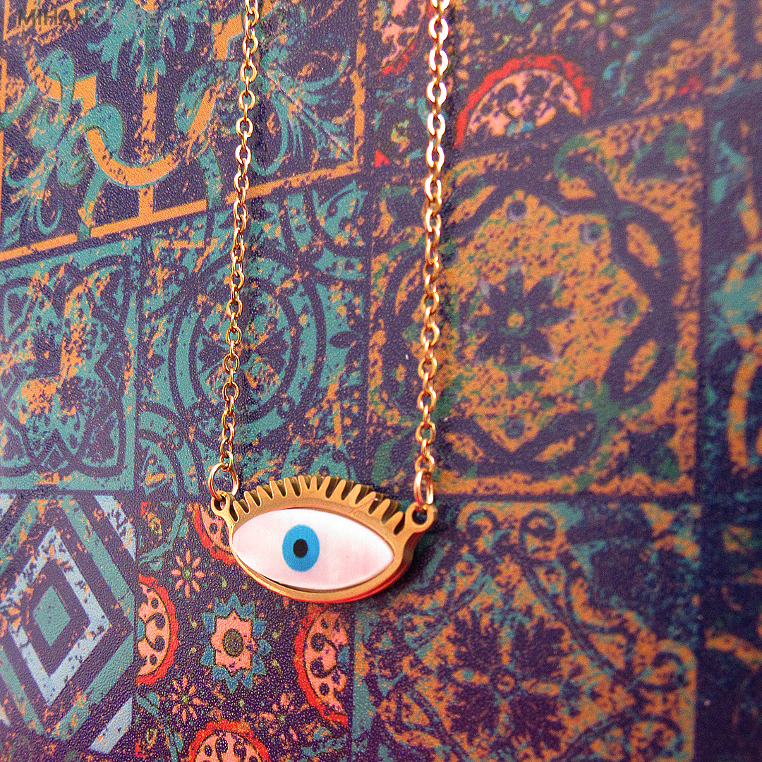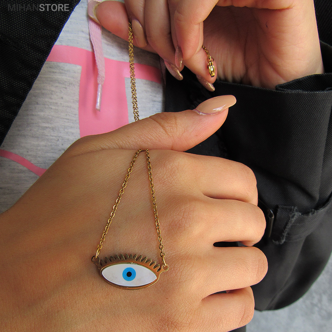 این گردنبند از استیل رنگ ثابت ساخته شده و دارای پلاک چشم نظر خاص و زیبا می باشد که به شکل چشم و مژه به زنجیر متصل می باشد. استفاده از گردنبند برای دوری از چشم زخم، سحر و آسیب به مال و جان توصیه شده است. حس آرامش خوبی را به شما منتقل کرده و مناسب استفاده کودک تا بزرگسال است. گردنبند طرح چشم نظر که از جنس استیل طلایی رنگ ثابت و ضد حساسیت می باشد، هیچ گونه حساسیتی برای پوست ایجاد نمی کند و با خیال آسوده می توانید از این گردنبند استفاده نمایید. این گردنبند یک زنجیر از مدل دیپلمات ساده طلایی با طول 42 سانتیمتر دارد که با قفل مدل قلاب محکم بسته می شود.این زیور به دلیل ابعاد ظریف و طراحی ساده و زیبایی که دارد براحتی مورد قبول سلیقه های خاص قرار میگیرد. همچنین زیبایی و خاص بودن این محصول یک هدیه ی مناسب و جالب برای هر مناسبتی می تواند باشد.