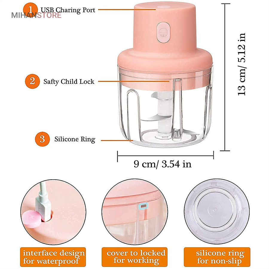 مینی خردکن شارژی یک خردکن 3 تیغه تیز است که به عنوان یک وسیله کاربردی برای خرد و میکس کردن سیر ، زنجبیل ، فلفل ، هویج ، سبزیجات ، پیاز و موارد دیگر بسیار مناسب است. طراحی عملکرد کلید لمسی مینی خردکن شارژی باعث می شود دست شما آزاد باشد تا موقع کار به کارهای دیگر خود برسید.این دستگاه با یک کابل USB و با ۳ ساعت شارژ ، می تواند از عمر طولانی باتری تا ۳۰ روز و استفاده گاهی اوقات لذت ببرید. این خردکن شارژی رو میتونید مسافرت یا کمپینگ هاتون هم همراه ببرید و از دست خرد کردن راحت بشید.این دستگاه ضدآب بوده و آب از محفظه زیرین به بالا و موتور نفوذ نمیکنه  این دستگاه از پلاستیک ABS ساخته شده و بسیار مقاوم بوده و همچنین تیغه ها ضدزنگ بوده.