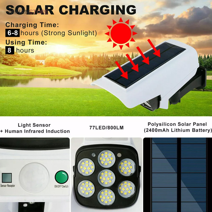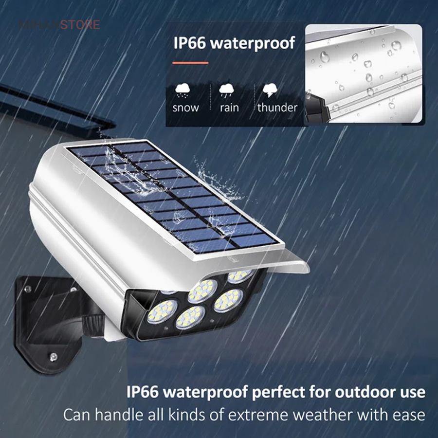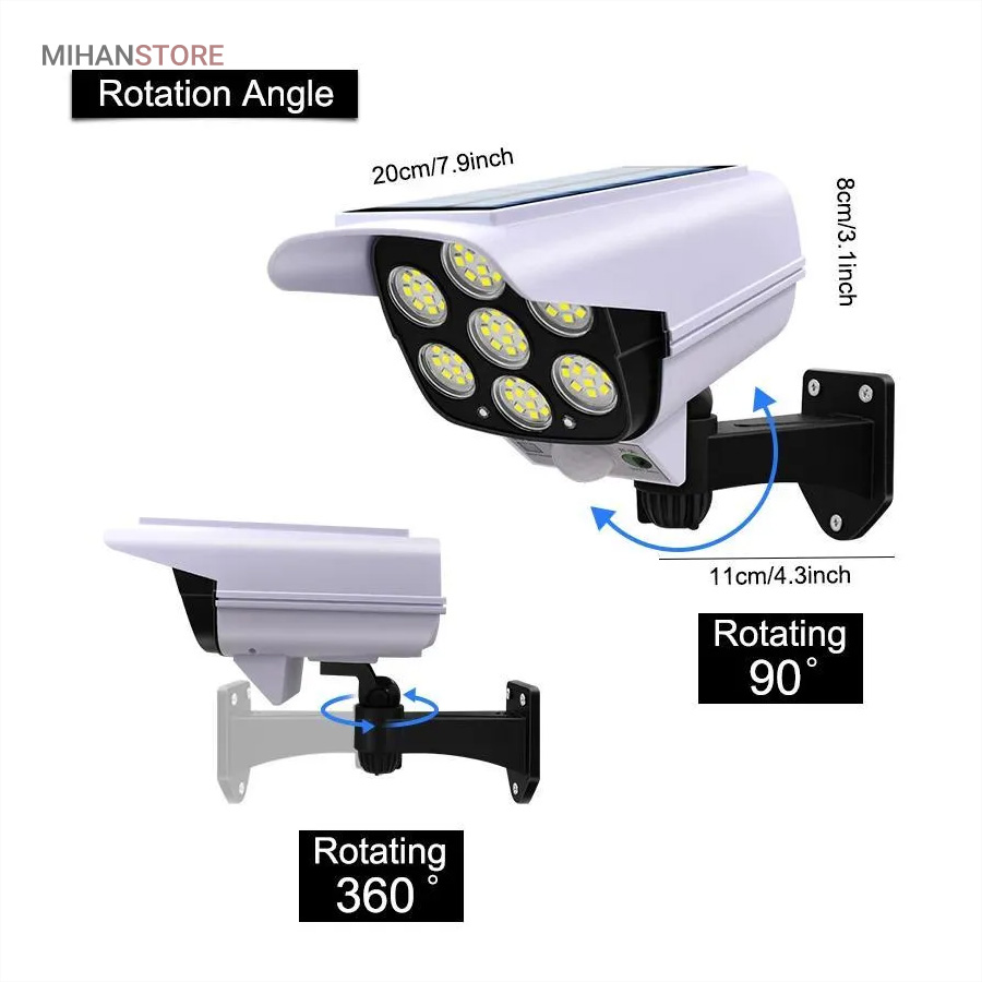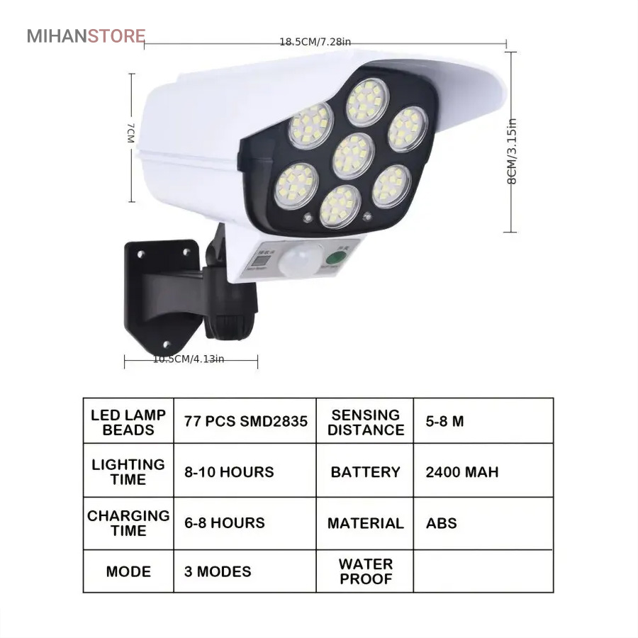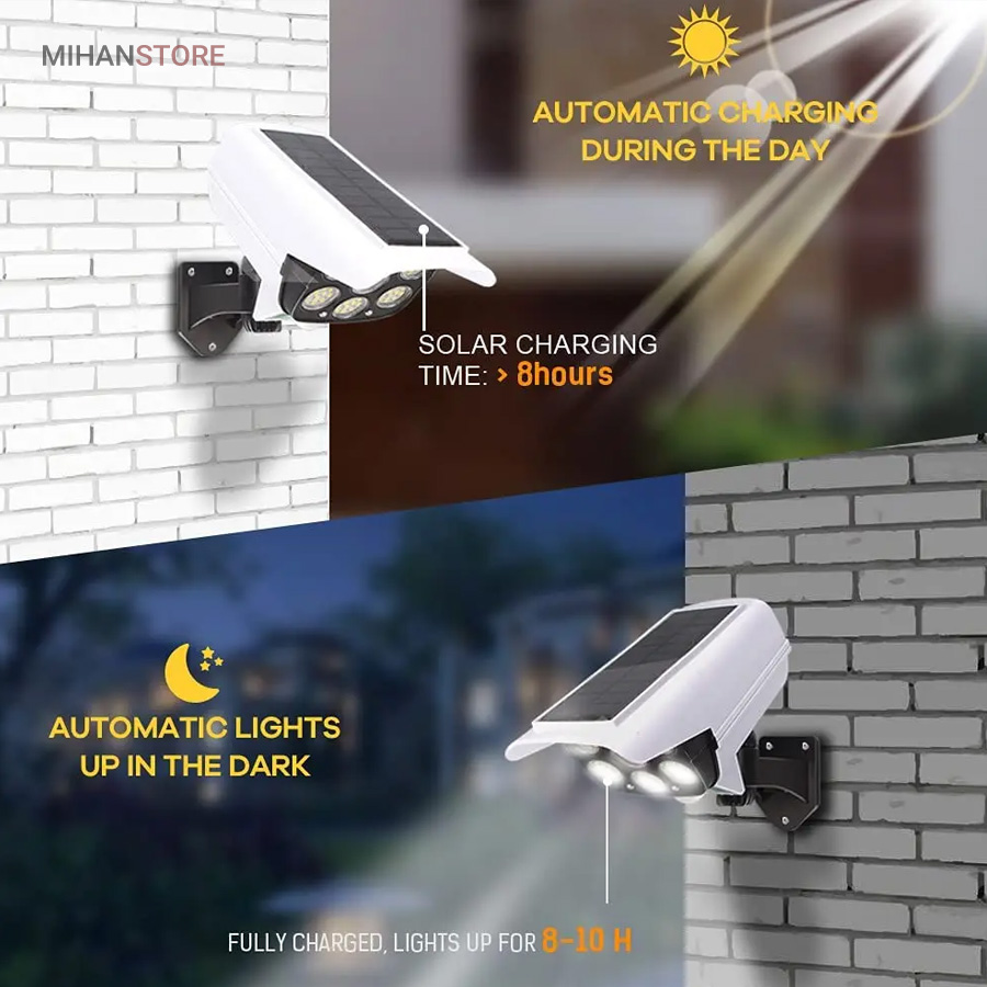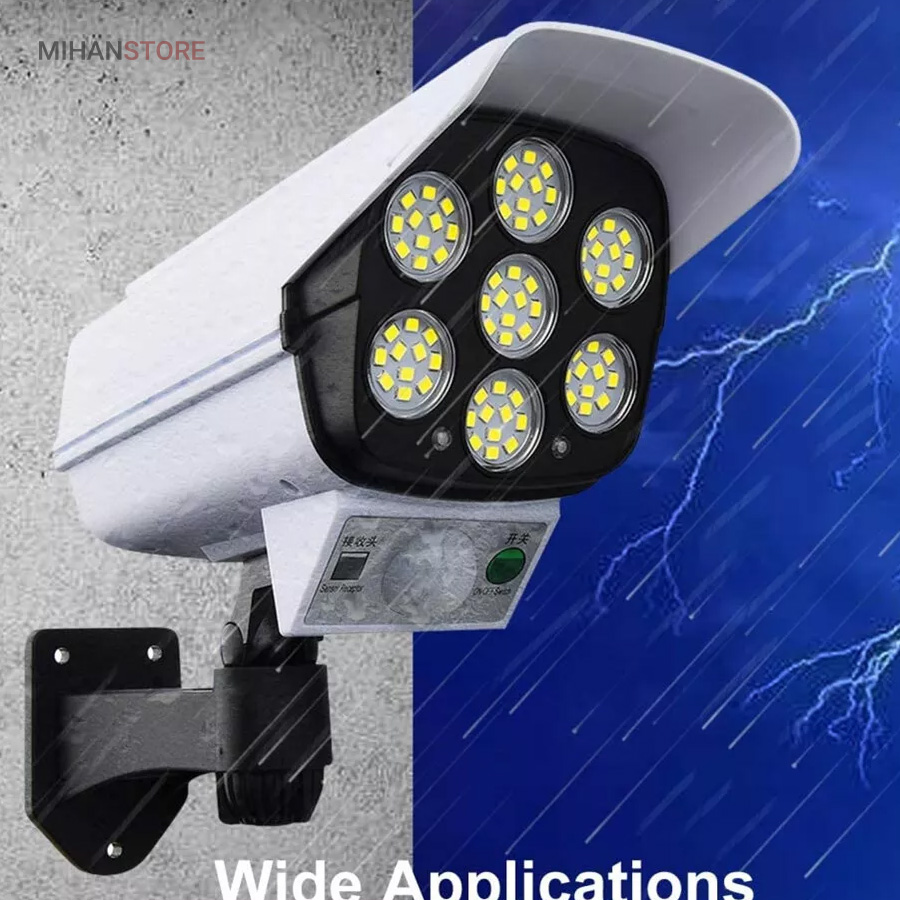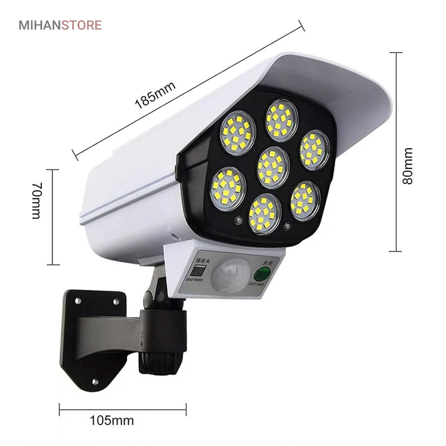 چراغ خورشیدی طرح دوربین که به چراغ پارکی نیز مشهور است دارای سه حلت نوردهی (1-پرنور 2-نور متوسط 3-کم نور) دارای حسگر حرکتی که با حرکت اجسام و یا موجودات در برد حسگر چراغ به حالت پرنور روشن و پس از 20 ثانیه و در صورت عدم حرکت به حالت تنظیم قبلی خود باز میگردد.دارای کنترل از راه دور. دارای فتوسل که با تاریک شدن هوا بصورت اتوماتیک روشن و با روشن شدن هوا بصورت هوشمند خاموش میشود. باتری داخلی پر قدرت دارای پنل خورشیدی با کیفیت جهت شارژ باتری های داخلی. ضد آب با درجه IP67، زمان نور دهی 8 ساعت با شارژ کامل. مناسب برای نور پردازی، کمپ، ویلا، حیاط، محوطه کارگاه، ورودی ساختمانها.