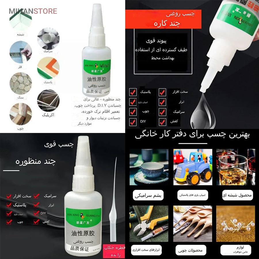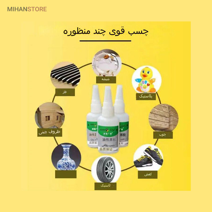 چسب قطره ای همه کاره قویترین چسب دنیا و محبوب ترین در کارایی که کاملا بر روی هر وسیله ای بدون اسیب به دست