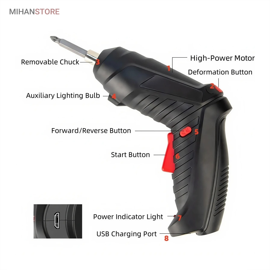 این پیچ گوشتی شارژی تفنگی 4/5 ولت، مجهز به باتری قوی جهت اثربخشی بیشتر و عمر طولانی تر است. این دستگاه قابلیت چرخش بدنه دارد به طوری که به صورت مستقیم هم قابل استفاده است. این محصول دارای 46 قطعه کاربردی میباشد که از مواد اولیه مناسب ساخته شده اند. این محصول برای استفاده در صنایع الکترونیک، کامپیوتر، مکانیک و مصارف عمومی مناسب است. پیچ گوشتی شارژی پوش مجهز به سیستم ابزارگیر منحصر به فرد با گیرایی بسیار قوی حین کار است، شامل چراغ LED مجزا است تا بتوان از آن در محیط کم نور و تاریک استفاده نمود و در آخر مجهز به نگهدارنده سریع پیچ گوشتی یا مگنت جهت کاربری سریع و آسان است. این دستگاه دارای کابل شارژ نیز میباشد. برای شارژ این دستگاه میتوانید از تمام شارژر های USB دار مانند موبایل، کامپیوتر و .... استفاده کنید.